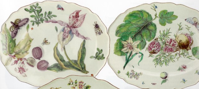 Meissen had started producing botanically inspired plates in 1742 with small-scale, rather delicate depictions taken mainly from Phytanthoza Iconographia by Weinnman but what came out from Chelsea was much more exuberant and showy.