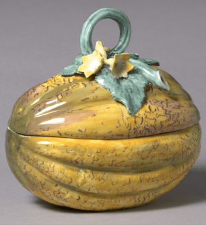 So it’s not surprising that Chelsea responded with pieces that were both functional and fun such as those listed in the 1755 sale such as a ‘large cabbage leaf and bason, 2 vine leav’d dishes & four sunflower leaves’, ‘two fine melons for desart,’ ‘four fine large apples and leaves for desart’ and cauliflower ‘sweetmeat boxes’.