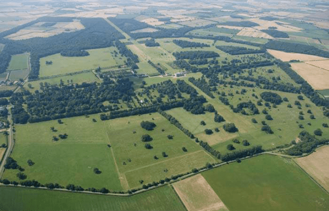 In 1719 Thomas Badeslade was commissioned to survey the Houghton estate which by then stretched to some 120 hectares. He shows the Jacobean house with an elaborate garden in front of it, and a further 3 gardens, probably including orchards to the side. The parkland was laid out with a geometric pattern of intersecting avenues. There was a central axis aligned on the hall with a number of minor axes, some of which continued the lines of the main walks in the garden. In the woodland groves there are various features including buildings and a mount.