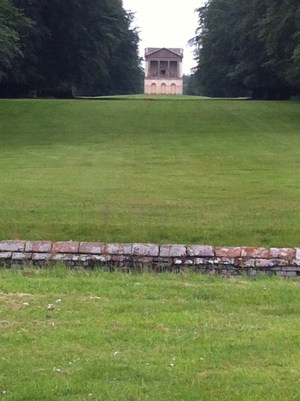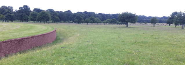 Nowadays the western garden is simple in concept but enormous in scale. As can be seen from the aerial view seen earlier a central lawn runs in the whole width of the house and its colonnades before narrowing down to down to a central grass ‘path’ flanked by blocks of formal wilderness which were recreated/replanted in the mid 20thc. The grass ‘path’ leads to a deep ha-ha with a semi-circular bastion that was reconstructed on the original 18thc line in 1999. At the far corner of the northern wilderness a path leads to a 19thc woodland covert which is underplanted with rhododendrons.