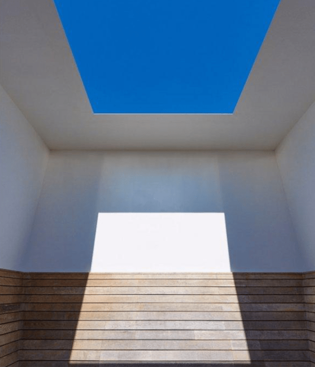 Depending on where they are situated they can be seen as land art, light art, sculpture, and installation or a combination of any or all of those elements.  The one at Houghton  is a six-metre cube of steel and oak and to be honest doesn’t look much from the outside, but push open the door and find yourself in a room empty apart from simple benches round the blank walls and then look up at the pocket handkerchief of sky seen through a hole in the roof makes you open your eyes to power of light.