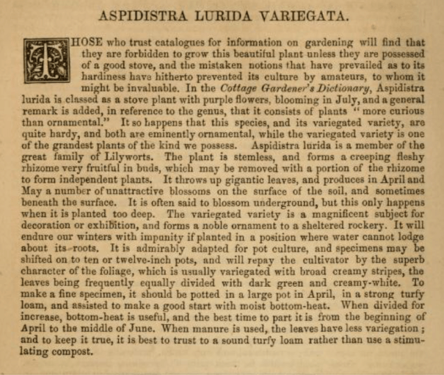 Aspidistra lurida only gets a passing mention as “more curious than ornamental” in Lowe & Howard’s Beautiful Leaved Plants : being a description of the most beautiful leaved plants in cultivation in this country of 1862 and although it fares slightly better in Shirley Hibberd’s New and Rare Beautiful-Leaved Plants of 1868 with a couple of paragraphs it is not illustrated in either work.