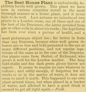 By 1881 Robinson’s journal The Garden carried a short piece claiming the Aspidistra is the best indoor plant. Neverthless, despite its apparent popularity, there were still no illustrations.