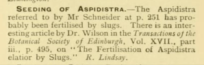The answer came from another reader in the next issue, based on evidence provided by botanists at the Royal Botanic Gardens in Edinburgh. It was thought that the Aspidistra has the most unusual pollination ecology among all flowering plants, since it was pollinated by, of all things, slugs.
