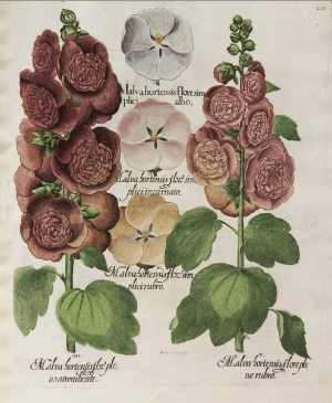 Hollyhocks – Alcea rosea L. [as Malva hortensis flore simplici albo] from Besler’s