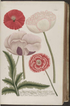 This gives the impression that Papaver rhoeas only comes in the “traditional” single red form and that Wilks was the first to notice and then begin a selection process. In fact there are illustrations of many shades of red, pink and white as well as double versions in much earlier texts, notably paintings by Georg Ehret in Weinmann’s Phytanthoza iconographia, 1745.