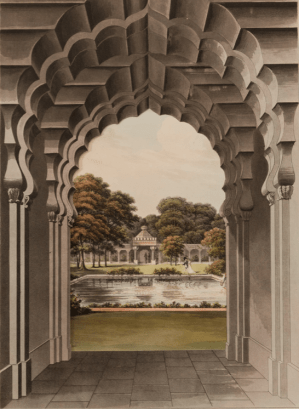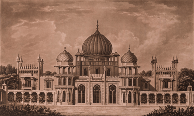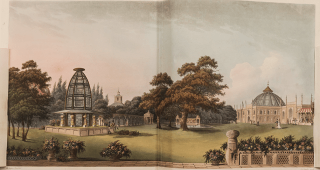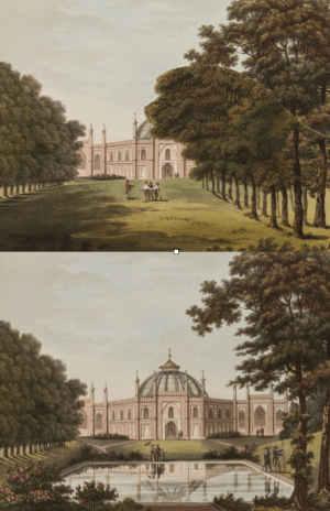Then Repton reveals what he had been planning to suggest: “The high honour of being in any degree useful to his Royal Highness was so flattering that I have lately been turning my attention to representation of Indian scenery, and had hoped to have produced some effects particularly connected with that style in the gardens at Brighton.”