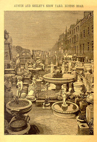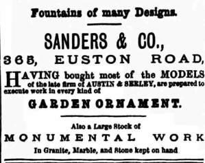 Austin died in 1850 but Seeley continued alone, advertising an increasing range of items all through the 1850s including over 200 designs for fountains at prices ranging from £10 to £400 and “an immense collections of vases and figures”, and often citing Austin’s invention of the artificial stone compound in 1826.