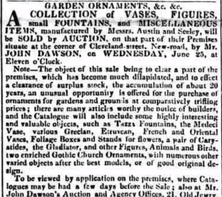 In fact Austin was in business as an “Artificial Stone Ornament Manufacturer” by 1826 at the latest, and had held a sale of a large quantity of stock, as well as the leasehold of some premises in Albany Street Regents Park in June 1827. But he was more than a maker of garden ornaments. According to Ray Desmond’s Dictionary of British Botanists and Horticulturist he was originally a nurseryman, whilst trade directories describe him as an architect, statuary mason and sculptor.