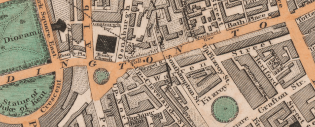 He lived at 1-3 Keppel Row, New Road, Fitzroy Square from 1830 and had premises further down the street on what is now Euston Road, near Regents Park. Keppel Row was a short terrace and evidently an “industrial” area on the edge of the metropolis. [His neighbours on the Row were, according to Robson’s street directory 1832, a stonemason, a malleable zinc works and Jonathan Saunders another maker of artificial stone items .