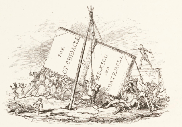 It was the greatest orchid book in most other senses too. Its size alone was extraordinary, at 30” x 22” it’s probably the “largest botanical book ever produced with lithographic plates” (The Art of Botanical Illustration, Blunt and Stearn 1994, p249) and at 38lbs in weight it was amongst the heaviest books ever produced, making it difficult to lift. It even included a witty cartoon by George Cruikshank, playing on the fact. Its Greek caption translates as “a big book is a big evil”. This quickly led to the book becoming known as “The Librarian’s Nightmare”.