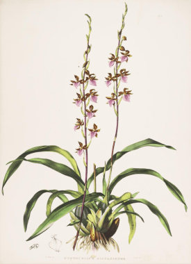 The 40 orchid illustrations were mainly done by Augusta Withers, who was flower painter to Queen Adelaide, and Sarah Anne Drake, although there were also two by Jane Edwards and one by Samuel Holden. Eleven of the species included were previously completely unknown to western science, and for most of the remainder it was the first time they had been illustrated.