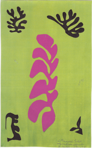 Art critics/ historians argue they show the beginning of ”process of botanization” where “human forms and vegetal forms coalesced in the artist’s imagination”. By that they mean that in portraits for example he emphasised the colourful backgrounds and clothing of his subjects almost as if they were “fantastical flowers, not specific people .” He himself said ”Look at a tree…It is like a human being.” He used vibrant almost unrealistic colours, reduced complex forms to simple bold abstract forms, and turned 3D objects into 2D shapes, as in this portrait of Picasso’s partner, Francoise Gilot. Even in old age when he was losing his sight the brilliantly coloured cutouts , with “their brilliant floral concoctions” show that ” the spirit of Morocco still alive in the artist’s imagination” [quotes from New York Times 1990]