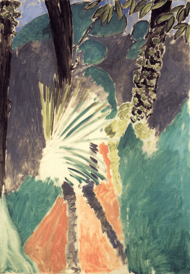 But now the problem was the reverse. It was too sunny and Matisse needed shade to work outdoors. He had met Walter Harris, the Times correspondent covering the Morocco crisis. Harris in turn introduced him to Jack Brooks who lived in a large villa with extensive gardens, overlooking the bay to one side and the countryside on the other. “The vegetation has all the blazing brilliance of Normandy and such decorative force. How new everything seems, too, and how difficult to do with nothing but blue, red, yellow and green.”