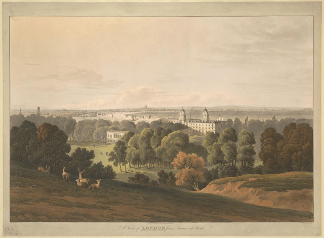 “The opening subject of the Eidophusikon represented the view from the summit of One-tree Hill, in Greenwich Park, looking up the Thames to the Metropolis; on one side, conspicuous upon its picturesque eminence, stood Flamstead House; and below, on the right, the grand mass of building, Greenwich Hospital, with its imposing cupolas, cut out of pasteboard, and painted with architectural correctness. The large groups of trees formed another division, behind which were the towns of Greenwich and Deptford, … the intermediate space was occupied by the flat stage, as the pool or port of London, crowded with shipping, each mass of which being cut out in pasteboard, and receding in size by the perspective of their distance. The heathy appearance of the fore-ground was constructed of cork, broken into the rugged and picturesque forms of a sand-pit, covered with minute mosses and lichens, producing a captivating effect, amounting indeed to reality.”