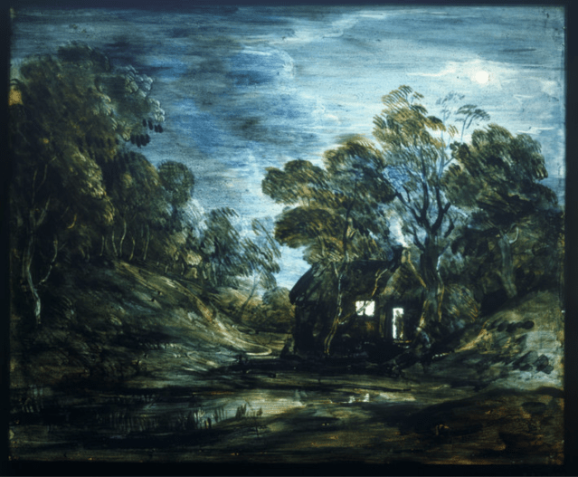 Wooded Moonlight Landscape with Pool and Figure at the Door of a Cottage, Gainsborough 1871/2, V&A