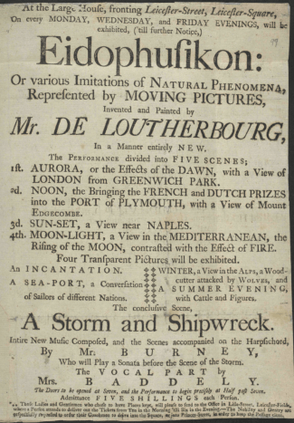 De Loutherbourg lived near Leicester Square and on 26 February 1781 he advertised a novel attraction at his house. It was described as ‘Moving Pictures representing Phenomena of Nature’ or the ‘Eidophusikon’.