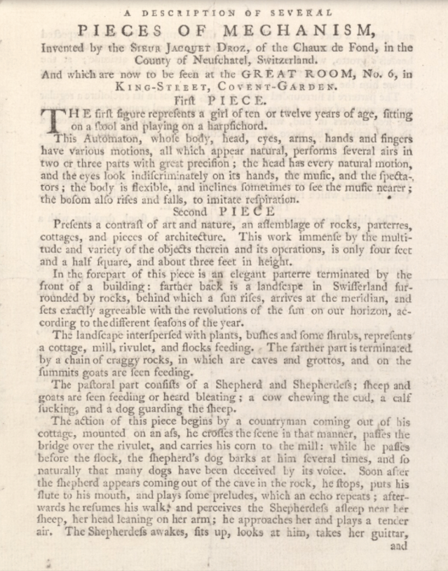 although annoyingly the last part of the story, on the other side of the handbill hasn’t been digitized! At the same time another advertisement for the exhibition added that the trees in the formal garden flowered and fruited, the fountains played, birds flew and they and assorted animals made appropriate sounds. In the centre of the model there was also a a girl playing the dulcimer and two ladies dancing, with ‘great regularity and grace’”. Clearly the whole thing, despite being fragile, was a mechanical tour de force showing a populated landscape “artistically contrived.”