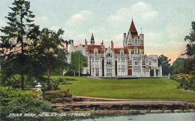 In 1889 Frank Crisp bought two villas on the edge of Henley, Friar Park and Friar’s Field for a total of £18,000 and merged their grounds into a 62 acre estate. He then commissioned a little-known architect Robert Clarke Edwards to help him rebuild Friar Park as a weekend retreat. Given the scale this was some retreat! Friars Field was initially left standing but in November 1895 was sold at auction for building material for £240 and demolished. [Henley Advertiser 16.11..1895]