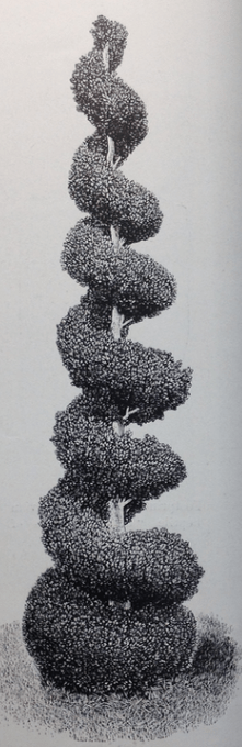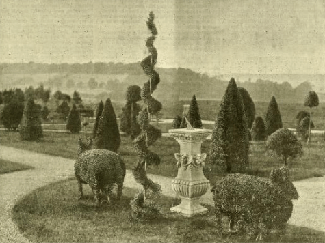 There were also “afternoon tea tables, peacocks, presentation cups, columns, pyramids, ovals… [and] umbrellas” This topiary garden was one of a large number of such being created in the wake of the “rediscovery”, of topiary work at Levens Hall or Elvaston Castle – “a feature that was one time exceedingly popular, but that was subsequently the object of almost universal ridicule.” Later it was renamed “The Dial Garden”.