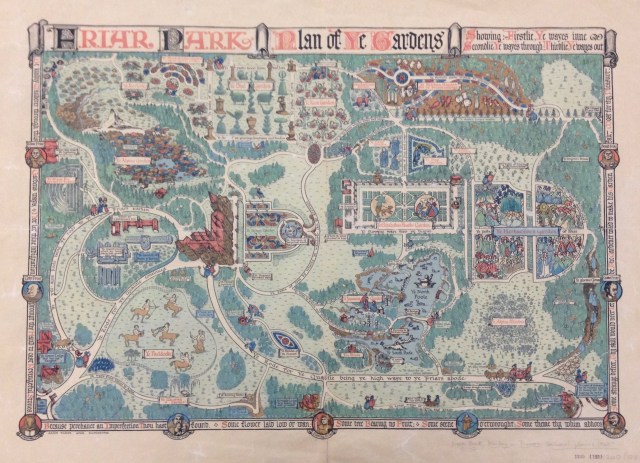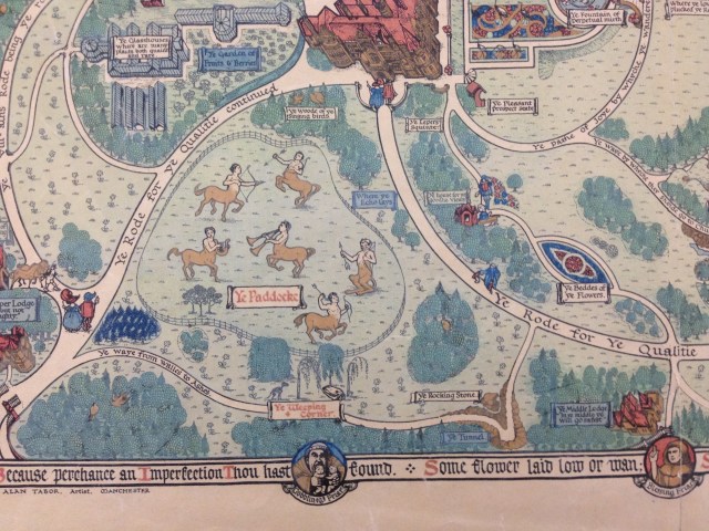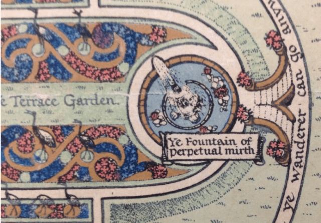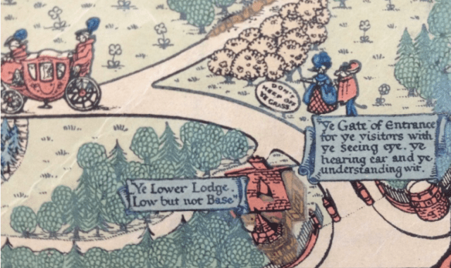 But realising that a large volume wasn’t necessarily right for everyone, in about 1914, he commissioned Alan Tabor, a young Manchester-based calligrapher and book illustrator to produce a fold-up map of the estate to serve as a simple visual guide. Unfortunately only a few snippets of it are available on-line, and they are uncredited so I hunted it down in the map room of the British Library.When I took it to my desk I almost shattered the hallowed silence of the Map Room by laughing out loud. I’m going to use details from it throughout the rest of my comments on Friar Park & hope you’ll find it as amusing as I presume Frank Crisp did.