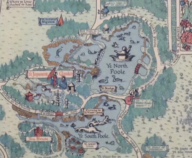 “Presently the bog-garden comes into view” largely planted with iris and ferns although it was still being extended. It was next to the lake,”a pretty piece of water, containing an island that adds considerably to the charms of the scene.