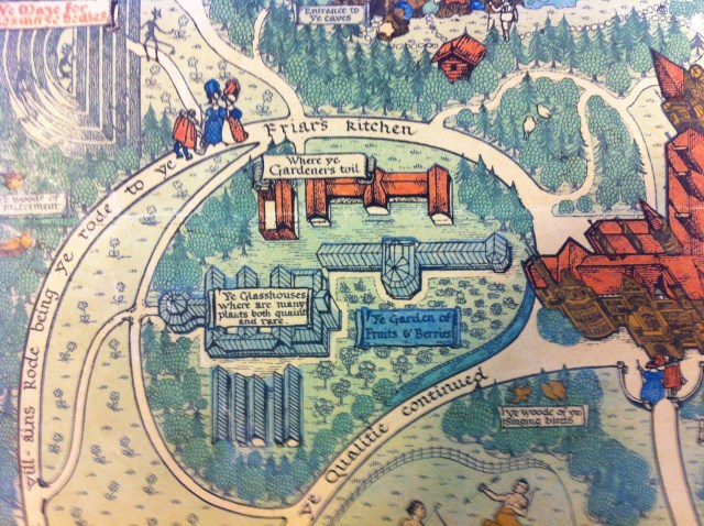 “At this point we arrive again at the rock garden entrance of the caves but bypassing back through the gnome cave the greenhouses can be reached….”