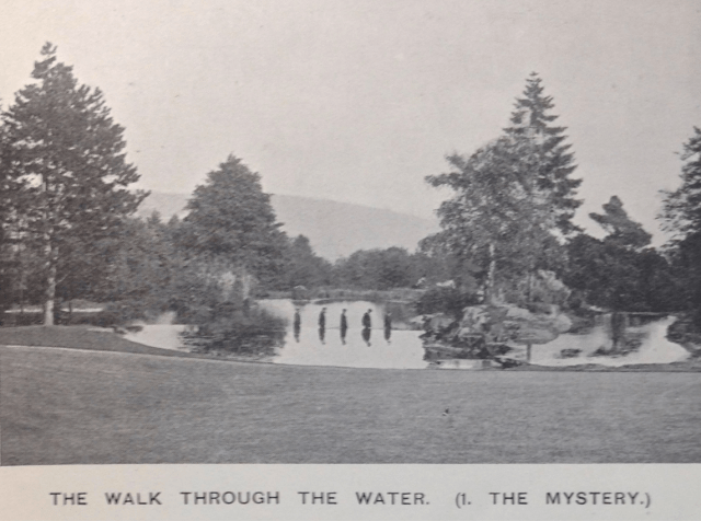 At the base of the mountain was a miniature Swiss chalet, “where one may sit and enjoy the scene, comparing all the main features with a little bronze model of the Matterhorn which Sir Frank had made for the entertainment of his guests.” From there  “we now gaze up a tortuous ravine, traversed by a stream which forms a series of cascades and still pools in which the trout are entirely at home.”