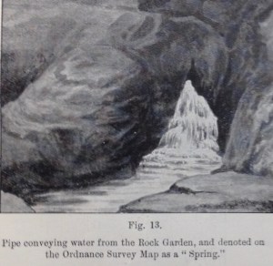 But this is not all. Crisp had designed much more than just a spectacular rock garden. Underneath “much of the natural scenery”  were “labyrinthine caves, caverns, grottoes, and icy recesses, forming an underland as marvellous almost in its artificiality and humorous contents and contrivances as the overland.”  Annoyingly Drury then adds “It is not, however, our province to deal with this section of the attractions of Friar Park. It would demand an article in itself, in which, with humour and a love for the grim and weird, would be exemplified quite outside our own special domain of horticulture.”