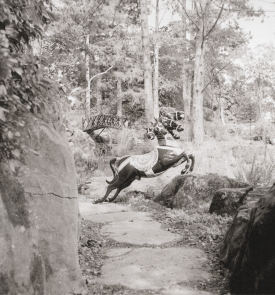Harrison admired Crisp’s creativity and humour describing him as a cross between Walt Disney and Lewis Carroll, and he tried to add things in keeping with the same spirit. To mark his son Dhani’s 21st birthday he installed a boat in a tree – as mad a feature as Sir Frank’s stone crocodile or the sign, put up after losing many many goldfish: ‘Herons will be prosecuted!’