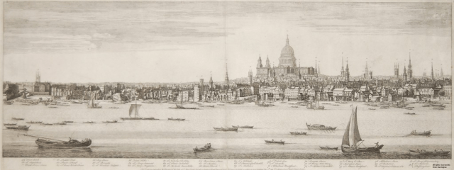 Between 1728 and 1753 they also produced a separate series of smaller single sheet prospects of the country’s towns, sold in sets of six, at 15 shillings a set, and one much larger 5 sheet panorama of London from the Thames that was about 4 metre long when joined together.