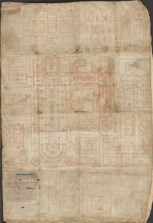 It might not look much at first glance, just lots of red ink lines and some brown lettering on five pieces of parchment sewn together to make a single large sheet [113cm x 78 cm or 45 x 31 inches]. However, the plan of the buildings and gardens of the abbey at St Gall in Switzerland is almost 1200 years old making it the only major architectural drawing to survive from the end of the Roman Empire in the West until the 13th century.