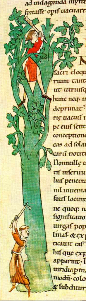 Saint Adelard also gave advice to his fellow abbots about how to treat their gardener: “The gardeners should receive carts from the shed every year according to custom. They ought to receive all iron tools from the chamberlain, who should supervise the smiths according to the custom of the community. If any of the tools should be broken, let the gardener show them to the chamberlain and let him have them repaired or give out another metal appliance and take in the broken one. Furthermore, those tools must then be repaired by the chamberlain in whatever way may be necessary. And for cultivating the field or for carrying out any other needs, let each one have six trenchers, two spades, three hatchets, one pick-axe, two sledges, large and small, one pruning-knife, one gulbium, two sickles, one scythe, two trunci, one coulter, one scerum, and other instruments kept in the chamberlain’s office, as are winnowing fans, casting shovels or other things of this sort. Whenever old equipment breaks down, the gardener should tell the abbot. The abbot will advise him about obtaining replacements.”