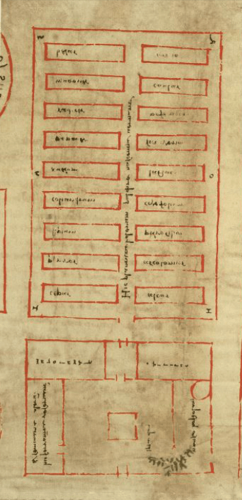 There are two possible theories about why the plan was drawn up in the first place. Some scholars argue that it was a blue-print for a standardised monastery designed as part of an attempt by Charlemagne’s son, Louis the Pious, to establish Benedictine monasteries throughout his empire. It could be adopted and perhaps adapted to fit any new site and size of monastery. The other theory is that it really was a building plan for Abbot Gozbert of St Gall, who wanted to rebuild the monastery there.