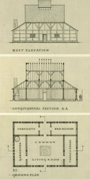 The garden building stretched across the width of the vegetable plot and was about 35ft deep. Inside it was divided into several sections with 4 rooms round what the labelling calls a “common living room” [with a central hearth?] The “dwelling of the gardener” was on the right, the other garden workers slept in the two rooms closest to the garden itself and there was a “storage place for the garden tools and for the vegetable seeds” in the room on the left.