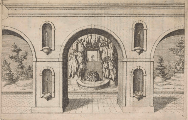 De Caus was born in 1576 at Dieppe in the Pays de Caux, which is part of Normandy. Although we know little about his upbringing we do know that in the late 1590s he travelled to Italy where he saw the great gardens at Pratolino outside Florence, the Villa d’Este and Frascati. This was to have a huge impact on his approach to both to style and the practicalities of garden design. By 1601 at the latest he was working at the Brussels court of the Archduke Albert, the governor of the Spanish Netherlands and was involved in designing aristocratic gardens there, including that of Albert himself at the Coudenberg Palace. He clearly impressed his employers and in 1605 was appointed ‘fountain engineer’ [“ingéniaire à la fontaine artificielle], but it seems they weren’t impressed enough to pay him promptly or fully and he is known to have left a large grotto/fountain complex unfinished as a result.