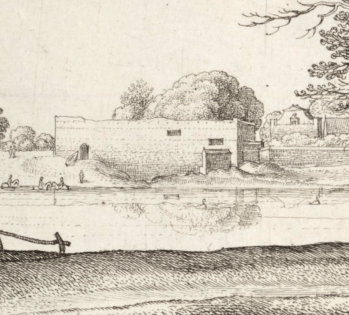 Work at Richmond ceased on Henry’s early death from typhus in 1612 so the bulk of the gardens were never completed. However the grotto base was so substantial that it was still there in 1653 when a parliamentary survey described it as “That modell of building intended for a waterhouse called the Rockhouse but never finished, situate and being on the aforesaid parcel of ground called the Wharf, being raised with a brick wall one storey high and not covered.” It can be seen in Wenceslaus Hollar’s 1638 engraving of the palace. The engine to pump water out of the river can be seen on the far left of Hollar’s print.