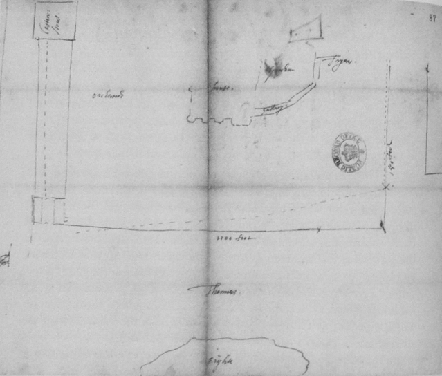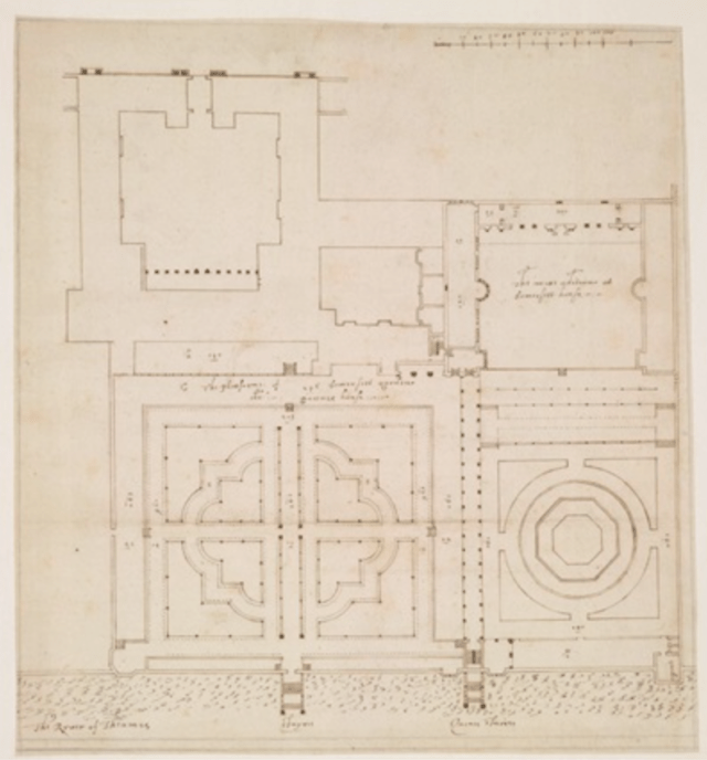 Robert Smythson drew a plan of the grounds of Denmark House [as Somerset House was then known] somewhen between 1609 and 1612 while work was still taking place. The accounts show payments of the new Terrass…with railes and balusters of stone.” and for “the making of a Force with divers brass workes to bring water into the garden.”