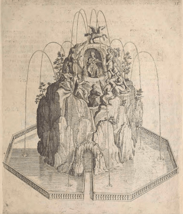 The description concluded by explaining how “the water was let play. Above at the very top of the crag it sprang up as thick as an arm, and to and fro out of the mountain as well. It is thus a very beautiful work and far surpasses the Mount Parnassus in the Pratolino near Florence.”