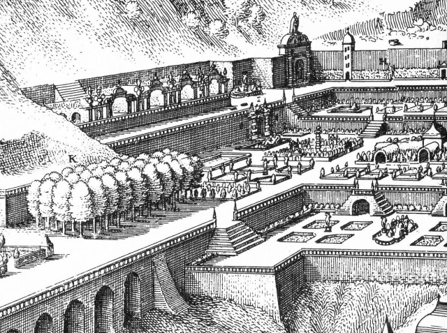 It meant that de Caus first major job was to decide how to deal with the terrain. Engineers cut a series of terraces from the mountainside, and buttressed them with thick retaining walls. I have not seen any account of how this mountain-moving was done, nor how sufficient earth was introduced but it must have been a mammoth technical feat.