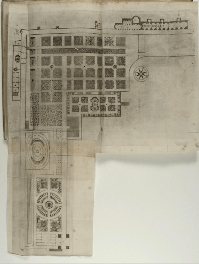 The Flower Garden, at the very end of one of the arms of the L, was highly symbolic as well as highly decorative. It was circular and divided into 4 sections, one for each season, and centred around what appears to be a rustic Mount Parnassus fountain.