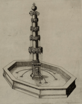 The Parterre of the Column was quadripartite in form around a hexagonal basin that had a rustic Ionic column in its centre. The column was a giant water feature, with water pouring from stone “icicles”, and from the grotesque faces at the base. On top is an orb and cross which formed part of Frederick’s coat of arms. The four sections were 55ft square with a complex knot pattern, and ornamented with orange trees in pots.