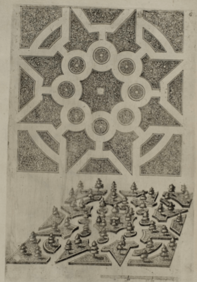 Next to that was the Parterre of Oranges with a very different and distinctive pattern based on an eight-pointed star. De Caus referred to “eightness” in Institution Harmonique, his treatise on music – “the divine science” – and “audible geometry” – and says it “encloses all consonances within it.” The orange trees are arranged according to another commentator ” to express all possible permutations of harmonic order”.