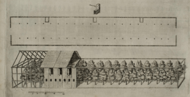 De Caus also suggested that it would be better to have a permanent stone framework so that each winter it would merely be a question of putting back the windows to protect the trees, and he added an image of what this should be like.