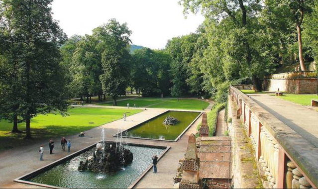 Continuing the diagonal line of Frederick’s gaze down to the terrace below, there were two more parterre gardens, one centred round a statue of Ceres and the other around one of Pomona. In between them is a basin containing statues of two river gods representing the Main and the Necker rivers, which flowed through the Palatinate.
