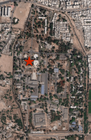 Aerial view of the complex today. The boundaries are still clear but the ground largely developed. The palace itself is marked with the red star.