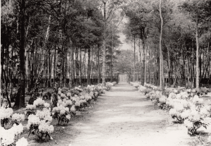 The catalogue for the American Exhibition explains what Goldring, who was described as “Chief of the Horticultural Department”, actually organized. “The central garden, or that immediately contiguous to the exhibition building, is laid out in a rigidly formal style, which tends to heighten the effect of the north facade of the building, while the arrangement of broad and straight walks allow ample space for the free circulation of large masses of people.”