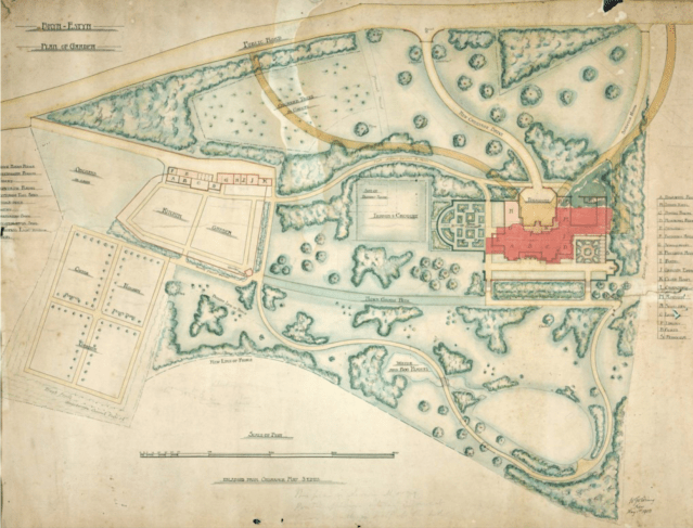 Maureen Thomas has researched Goldring’s work in Wales, and published an article about it in the Bulletin of our sister organization, the the Welsh Historic Gardens Trust in 2009. At Bryn Estyn near Wrexham[now sadly probably better known as the infamous “care home”] Goldring was commissioned in 1903 by Fredrick Soames, a wealthy brewer, to design a garden for his new house, which he did combining formal elements such as a terrace and geometric beds with informal ones further away from the house. There was also a classical temple and a walled kitchen garden. Much of Goldring’s work has disappeared but there the kitchen garden is back in use as part of a training project.
