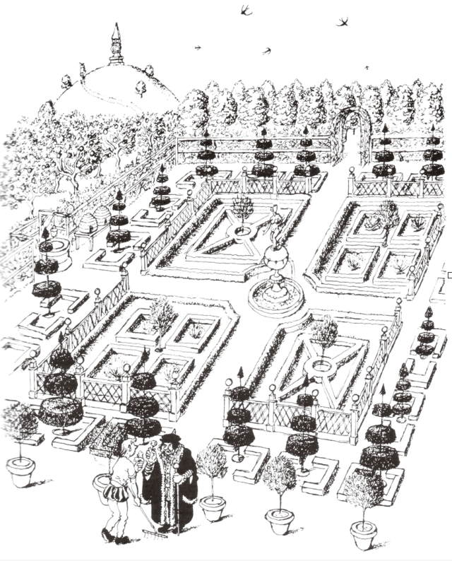 She praises much but again there’s an analytical sting in the tail, so while “a modest Elizabethan garden must have been a charming spot… grander gardens must have suffered from the ostentatious pomposity which were to swell in the following century.”