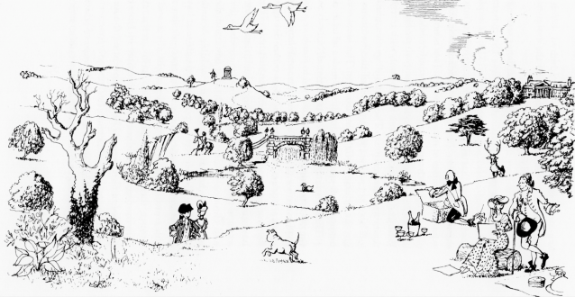 The author Anne Scott-James makes it clear from the very outset that it “is NOT a book by me, illustrated by Osbert Lancaster.” Nor is it “an attempt to write a complete history of British gardens as a rival to the recently complete History of British gardening by Miles Hadfield.” Instead she claims to have “merely written a series of essays to accompany a set of drawings on which my husband was suddenly and unexpectedly moved to embark.” The fact that “sometimes the only plant he felt like drawing was a yucca” made her “surprised that there is a not a yucca in every sketch from the Romano-British period onwards.”